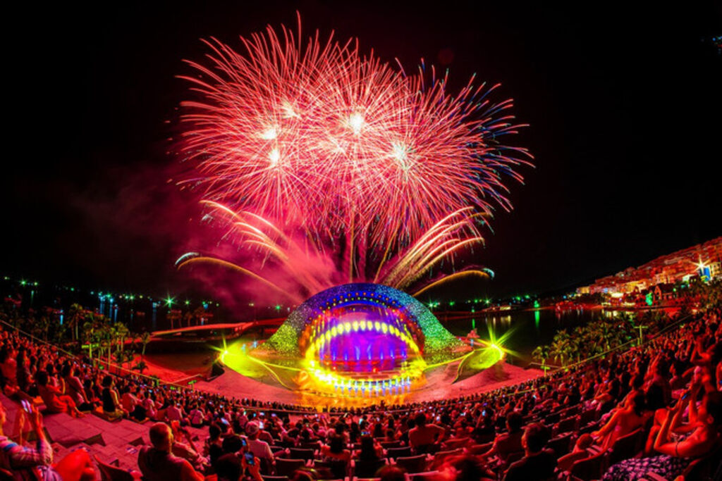 | Des milliers de visiteurs ont assisté au spectacle "Kiss of the Sea", qui a battu un record Guinness, à Sunset Town. |