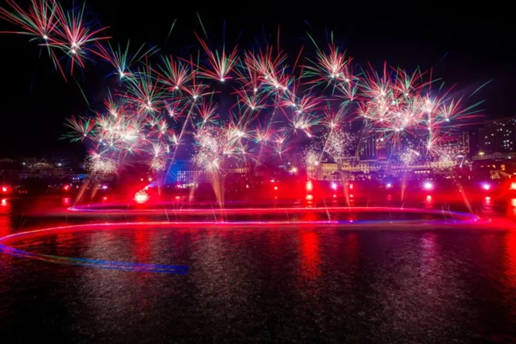 | En venant à Sunset Town, les visiteurs peuvent regarder le feu d'artifice de 7 minutes à la fin du spectacle "Kiss of the Sea" - un spectacle multimédia sur mer le plus grand d'Asie. |