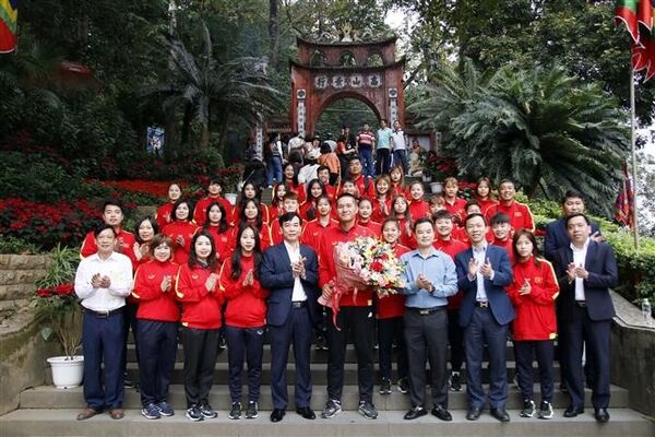 | Des joueuses de l'équipe de football féminin U20 rendent hommage aux rois Hùng, fondateurs du pays, dans la province de Phu Tho. |