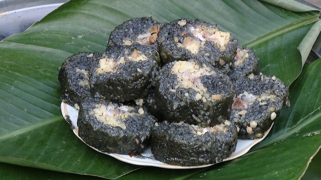 | Les ingrédients du bánh chưng đen sont du riz gluant mélangé à de la poudre de troncs et feuilles de ramie, des haricots mungo et de la viande de porc. |