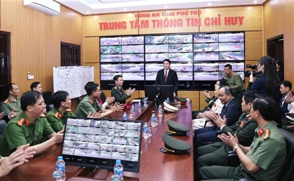 | Le président Luong Cuong (debout) visite le Centre d’information et de commandement de la Police de Phu Tho, le 7 avril. |