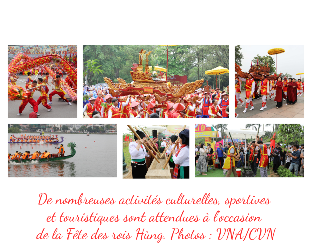 Des expositions d’artefacts, de documents et de photos à la bibliothèque de la province de Phu Tho et au musée Hùng Vuong, un programme de musique de rue au parc Van Lang, des représentations du chant xoan dans des maisons communales, un spectacle et des tirs de feux d’artifice... sont prévus.