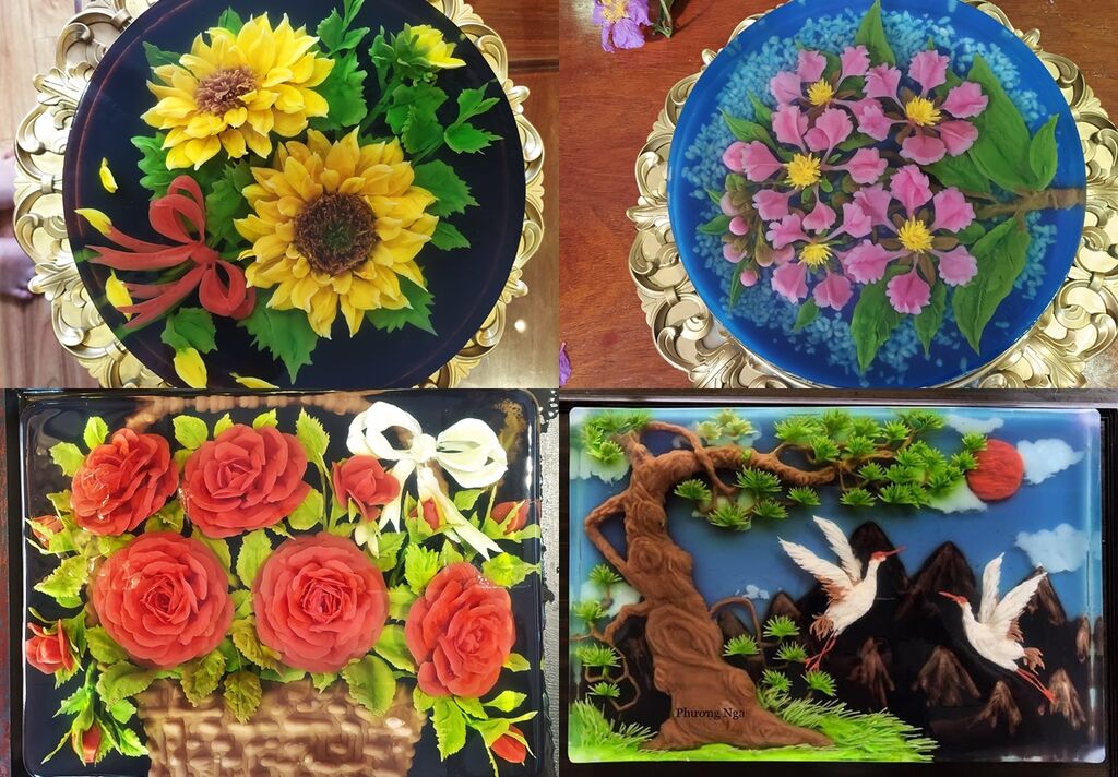 Avec ingéniosité, elle réalise de nombreux gâteaux en gelée 3D avec des dessins de fleurs (roses, pamplemoussiers, flamboyants, Lagerstroemia speciosa), de paysages, de personnages, d’oiseaux et d’animaux. Leur couleur se base sur les couleurs naturelles disponibles. Par exemple le jaune à partir de la poudre de curcuma ou de la poudre de citrouille ; le violet à partir des patates douces violettes ; le blanc à partir de lait ou lait de coco ; le vert à partir du thé matcha ; le rose à partir du fruit du dragon...