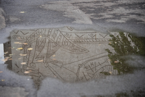 | La fresque des Pêcheurs, sur le «bloc Y» du quartier des ministères à Oslo se reflète dans une flaque d’eau |