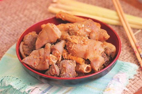 - Dans une poêle, verser une à deux cuillères d’huile, sauter à feu vif la citronnelle hachée et le piment en poudre pendant 2 minutes environ, puis ajouter les tranches de citronnelle. Ajouter ensuite les morceaux de pieds de porc, une cuillère de sucre, un peu de nuoc mam, et ajouter de l’eau jusqu’à immerger les 2/3 des pieds. Porter à ébullition puis baisser pour cuire doucement pendant 15 minutes et laisser jusqu’à ce que les pieds soient cuits.