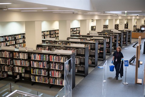 | Préparatifs avant la réouverture d'une bibliothèque publique à Manchester, en Angleterre, le 3 juillet 2020. |