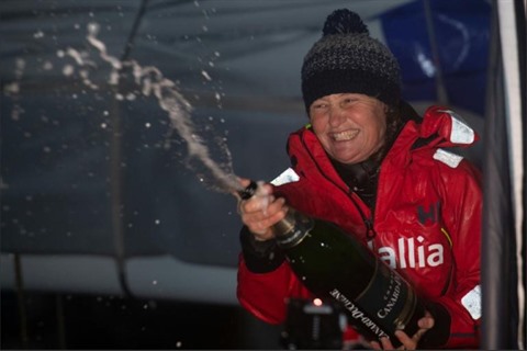 | La joie de la Britannique Pip Hare en franchissant la ligne d'arrivée, aux Sables-d'Olonne, le 11 février 2021. |