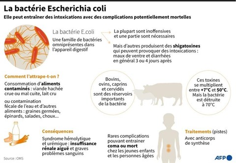| Infographie sur la bactérie Escherichia coli (E.coli), la façon dont elle s'attrape et les complications qu'elle peut provoquer dans de rares cas. |