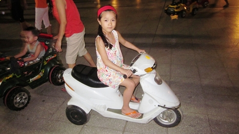 Finalement, désintéressée de sa facile victoire, ma fille vient me tirer par la main pour que nous quittions l’immense place et en retrouvions une plus petite, mais à la population encore plus dense s’il en est : la place Lénine. Située à quelques encablures de la place Ba Dinh, elle présente pour les moins de sept ans un intérêt non négligeable : la possibilité de conduire des voiturettes et des scooters électriques ou radiocommandés ! Entre patineurs à roulettes, amateurs de planches roulantes et autres fervents de sports acrobatiques, les bouts de choux exercent leurs talents de futurs conducteurs, en percutant violemment les chevilles des adultes, en s’offrant des embouteillages monstres et en se brûlant allègrement la priorité...