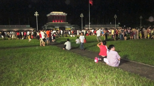 Il suffit de prendre les allées damées qui découpent les carrés de pelouse matérialisant les rizières vietnamiennes pour pénétrer sur une esplanade illuminée par de hauts projecteurs et noire de monde. Le Vietnam est un pays jeune, et ça se voit ! À croire que toutes les familles de Hanoi ont décidé de promener leur progéniture ce soir…