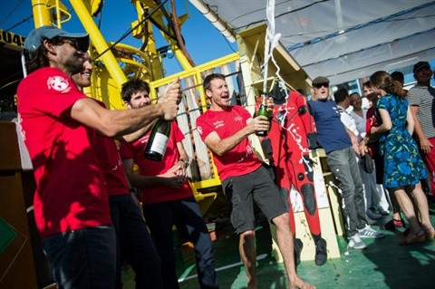 | Laurent Ballesta, Antonin Guilbert, Thibault Rauby et Yannick Gentil célèbrent leur remontée après 28 jours passés à 120 m de profondeur en Méditerranée. |