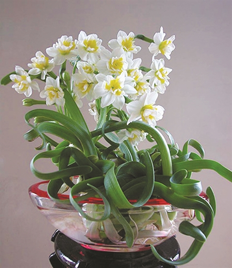 Le narcisse (Hoa thuy tiên), symbole de chance et de longévité, est censé apporter confiance, prospérité et bonheur à son propriétaire. Pendant les premiers jours de l’année, l’odeur du narcisse et des encens brûlés se mélange, créant une fragance douce.