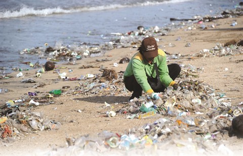 | Une femme ouvrière en train de ramasser des ordures dont une majorité de plastiques sur la plage de Kuta de l’île touristique de Bali, en Indonésie. |