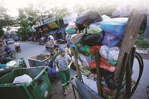 | Ramassage des ordures ménagères dans un quartier résidentiel de Hanoï, au Vietnam. |