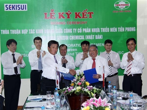 | Signature d'un contrat de coopération économique entre la compagnie par actions du plastique Thiêu niên tiên phong et le groupe japonais Sekisui Chemical, le 22 juillet à Hai Phong. |