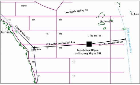 | Le lieu de fonctionnement de la plate-forme de forage Hai Duong-981 se situe entièrement dans la zone économique exclusive et le plateau continental du Vietnam, à environ 120 milles nautiques de ses côtes |
