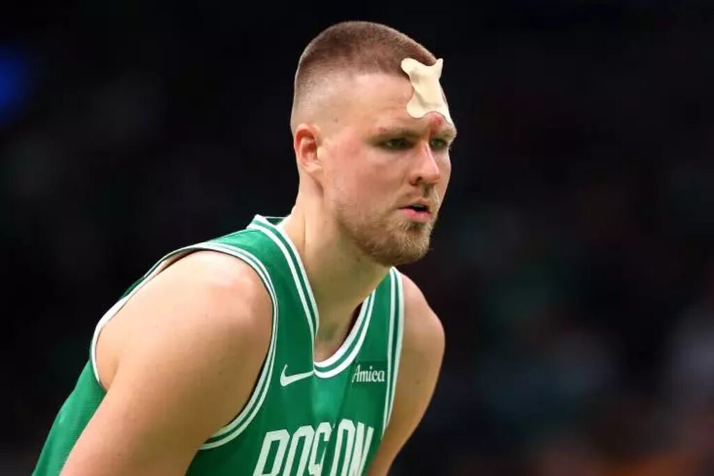 | Kristaps Porzingis (Boston Celtics) avec un bandage sur la tête lors du match de play-offs NBA contre les Orlando Magic à Boston, le 23 avril. |
