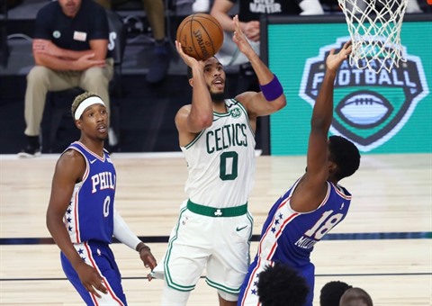 | L'arrière des Boston Celtics, Jayson Tatum, shoote un lay-up sur la tête de Shake Milton des Philadelphia 76ers à Disney Word, le 23 août. |
