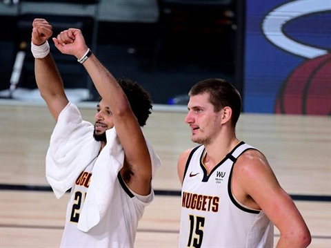 | Les joueurs des Denver Nuggets, Nikola Jokic (droite) et Jamal Murray (gauche) après leur victoire face au LA Clippers, le 15 septembre à Lake Buena Vista. |