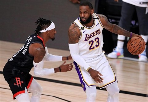 | LeBron James (d), des Los Angeles Lakers, face à Robert Covington, des Houston Rockets, en demi-finale de la conférence Ouest à Lake Buena Vista (Floride), le 12 septembre 2020. |