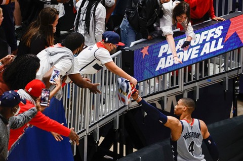 | Russell Westbrook, des Wizards, offre ses chaussures à un fan après sa victoire sur les Philadelphia 76ers, le 31 mai à Washington. |