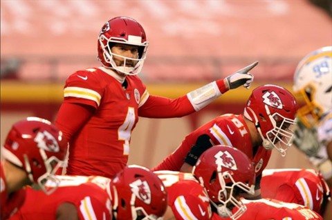 | Les Chiefs, dans le sillage du quarterback Chad Henne (#4), préparent une attaque contre les Los Angeles Chargers, lors de leur opposition dans le Missouri, le 3 janvier 2021. |