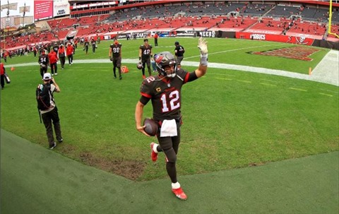 | Le quarterback multichampion Tom Brady avec les Tampa Bay Buccaneers après leur succès contre les Atlanta Falcons, le 3 janvier 2021 en Floride. |
