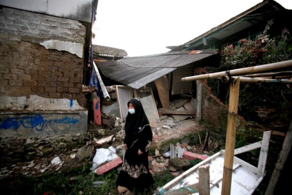 | Une femme passe près d'une maison endommagée par un séisme meurtrier à Cianjur, en Indonésie, le 21 novembre. |