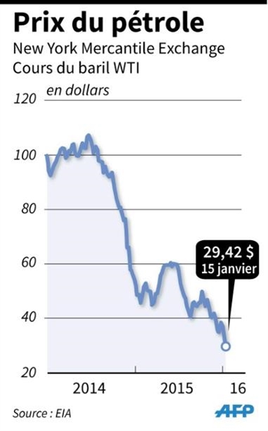 Le cours du baril de "light sweet crude" (WTI) pour livraison en février a perdu 1,78 dollar à 29,42 dollars sur le New York Mercantile Exchange (Nymex), soit son plus bas niveau de clôture depuis novembre 2003.