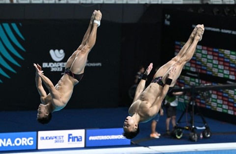 | Les Chinois Yuan Cao et Zongyuan Wang engagés en plongeon synchronisé, le 26 juin à Budapest. |