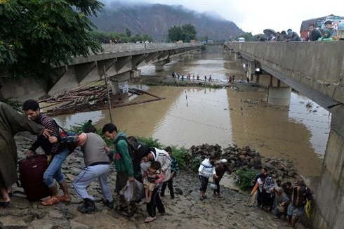 | Des habitants du Cachemire lors d'inondations à Srinagar, le 6 septembre. |