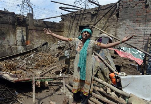 | Une Pakistanaise au milieu des décombres de sa maison détruite à Lahore par les pluies torrentielles de la mousson, le 6 septembre. |