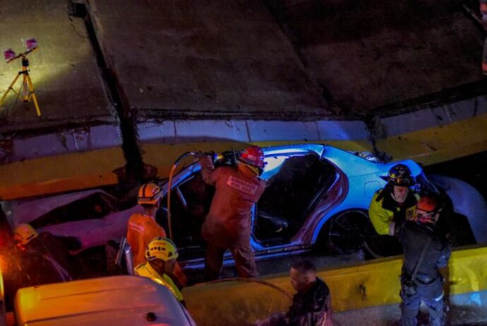 | Des sauveteurs recherchent des personnes coincées sous un mur qui s'est effondré sur plusieurs véhicules après de fortes pluies sur l'avenue 27 Février de Saint-Domingue. |
