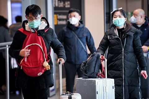 | Les passagers en provenance de Chine, quittent le terminal avec des masques en papier après leur atterrissage à l'aéroport Charles De Gaulle le 26 janvier 2020 à Roissy-en-France. |