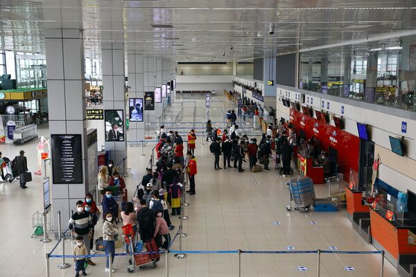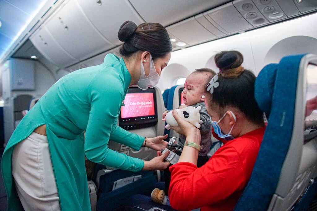 | À bord d'un vol de Vietnam Airlines transportant des travailleurs à rentrer dans leurs localités natales. |