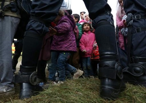 | Des enfants marchent avec des migrants près du village de Miratovac en Serbie, après avoir franchi la frontière macédonienne le 27 janvier. |