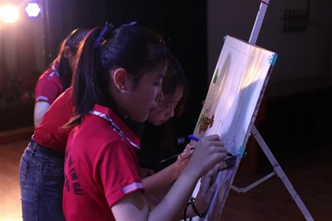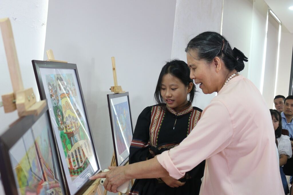 | Nguyên Thi Thanh Hoà, présidente de l'Association vietnamienne pour la protection des droits de l'enfant voit des œuvres. |