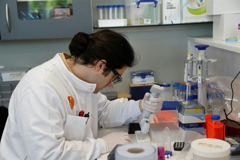 | Recherche dans le laboratoire de la firme britannique Exscientia à Oxford, le 24 avril. |