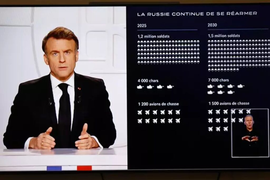 | L'allocution du président français Emmanuel Macron retransmise sur un écran de télévision, le 5 mars. |