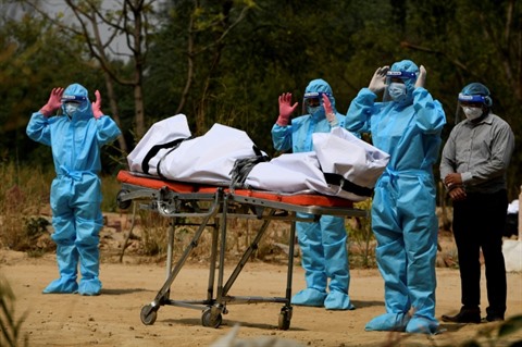 | Des proches d'une victime du COVID-19 lors de ses funérailles dans un cimetière de New Delhi, le 30 avril en Inde. |
