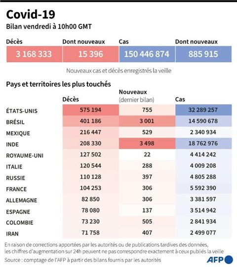 Plus de 150 millions de personnes ont été contaminées sur l'ensemble de la planète, dont près de six millions en une semaine, selon un comptage de l'AFP à partir de bilans officiels vendredi 30 avril.
