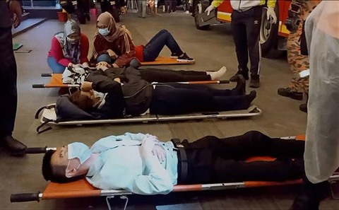 | Des passagers blessés, allongés sur des civières, après un accident impliquant deux trains, à la gare KLCC de Kuala Lumpur, en Malaisie, le 24 mai. |