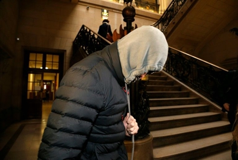 | Un défendeur anonyme arrive au tribunal correctionnel de Paris le 1er décembre 2015 à l'ouverture du procès de sept hommes accusés d'avoir recruté des jihadistes Français avant de les acheminemer vers la Syrie. |