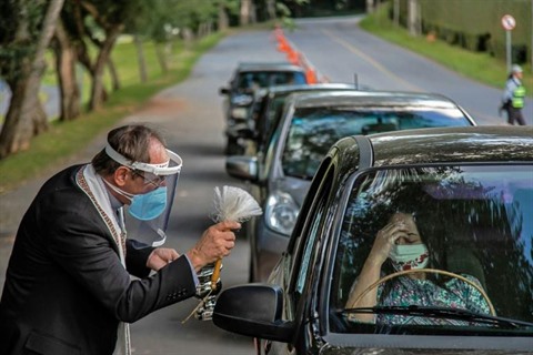 | Un prêtre catholique bénit les fidèles à bord de leurs voitures, le 11 avril à Curitiba, au Brésil |