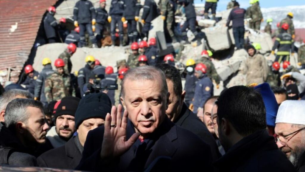 | Le président turc Recep Tayyip Erdogan, le 8 février à Kahramanmaras, deux jours après un séisme meurtrier en Turquie et en Syrie. |