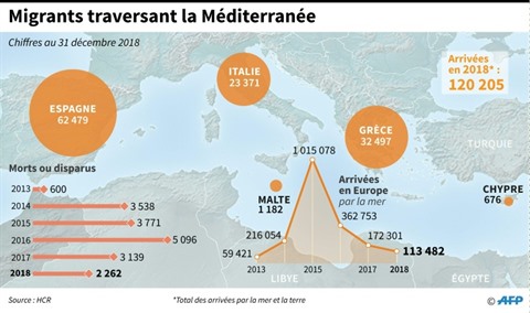 Un total de 2.262 migrants sont "morts ou portés disparus" en tentant de traverser la Méditerranée en 2018, contre 3.139 l'année précédente, selon les chiffres publiés par le Haut commissariat de l'ONU aux réfugiés (HCR) sur son site internet.