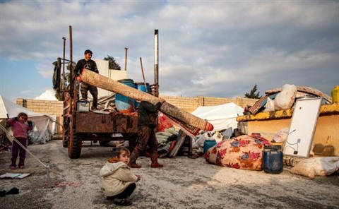 | Des Syriens sortent un tapis d'un camion dans un camp de déplacés près de Dana dans la province d'Idleb, le 27 décembre 2019. |