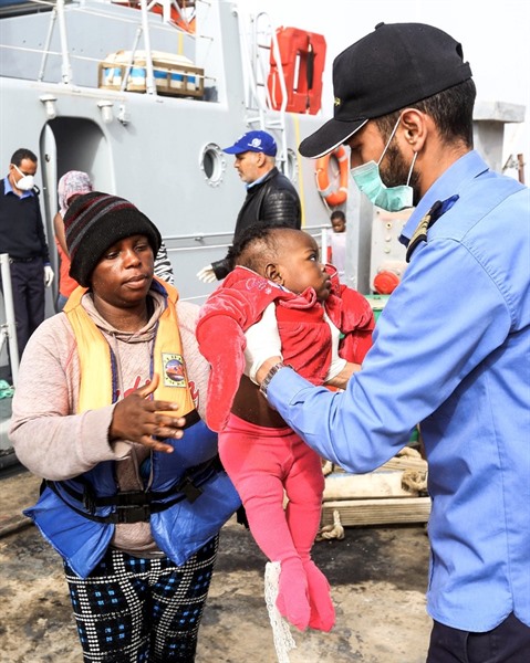 | Un enfant secouru au large de la Libye, sur une embarcation de migrants, est débarqué sur la base navale de Tripoli, 10 mars. |