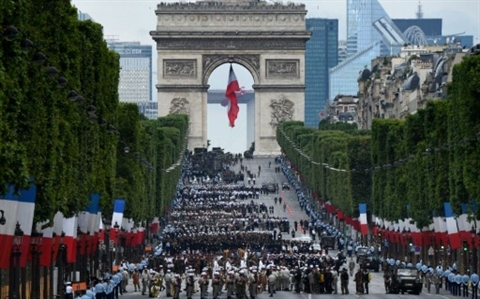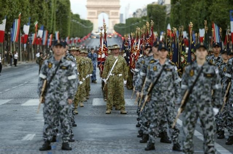 | Les troupes française positionnées près de l'Arc de Triomphe le 14 juillet à Paris avant le début du traditionnel défilé. |
