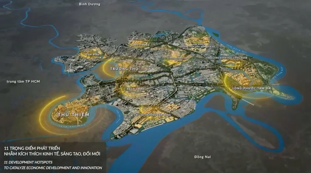 En particulier, les infrastructures de transport contribueront à l'expansion de la ville, avec notamment la mise en place de 9 lignes de métro urbaines et interrégionales, reliant Thu Duc au reste de Hô Chi Minh-Ville et à l'aéroport de Long Thành. Ces nouvelles lignes devraient répondre à 50% à 60% des besoins de transport de la ville. De plus, des routes stratégiques seront aménagées, telles que la liaison entre les ports Cát Lái - Phú Huu et l'autoroute Hô Chi Minh-Ville - Long Thành - Dâu Giây, ou encore la connexion entre la ceinture 2 et l'autoroute Hô Chi Minh-Ville - Chơn Thành.